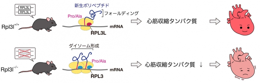 - RPL3Lを含むリボソームが欠損した心臓では心臓の収縮に関わる遺伝子の翻訳ダイナミクスが乱れることを見出した。