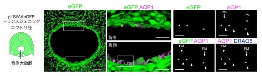 図1 造⾎性⾎管内⽪細胞の細胞膜と液胞膜に局在する⽔チャネル(AQP1 背側⼤動脈(※3)の腹側部を構成する⾎管内⽪細胞が内⽪-造⾎転換をおこす。これらの 造⾎性⾎管内⽪細胞は液胞(*印:緑⾊蛍光タンパク質eGFP 陰性の領域)を有する。AQP1 は造⾎性⾎管内⽪細胞の細胞膜(PM)と液胞膜(⽮頭)に局在する。)