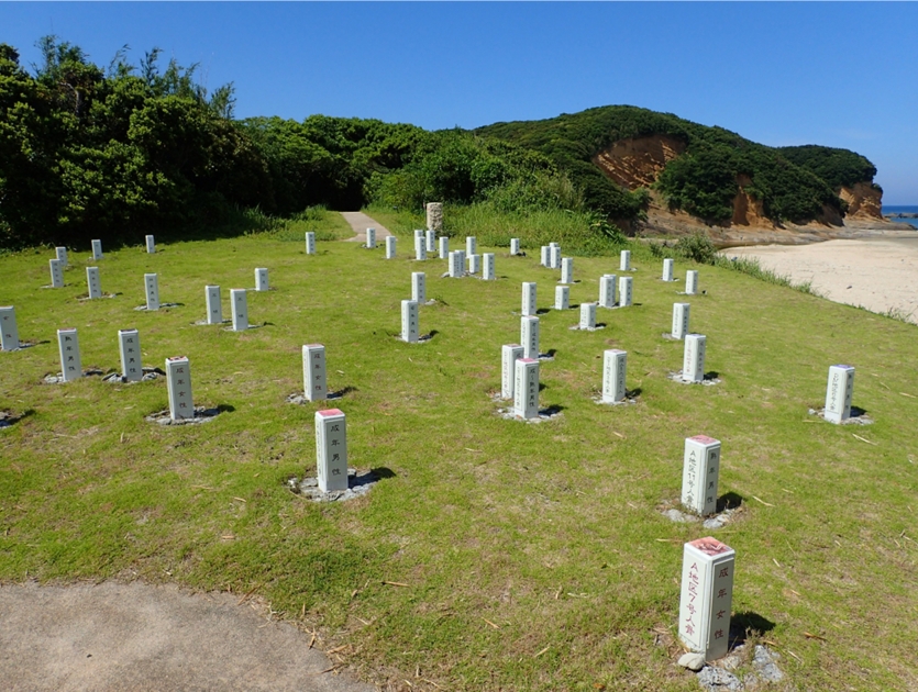 図3 鹿児島県種子島の広田遺跡(各マーカーは墓が発見された場所を示し、性別とおおよその年齢層が記されている。)