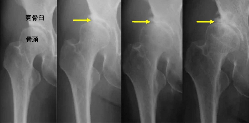 図1 発育性股関節形成不全に伴う変形性股関節症のX線変化(左端は股関節症発症前の発育性股関節形成不全患者のX線写真。右に進むにつれて変形性股関節症が進行している。)