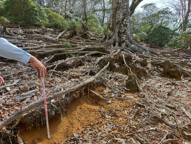 - ⼭岳ブナ林が広がる九州⼤学宮崎演習林(椎葉村)において、⼟壌侵⾷の指標である根の露出程度とブナの成⻑量との関係を調べたところ、根の露出程度が⼤きいブナほど成⻑が低いことが明らかになりました。