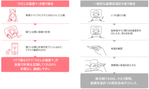 就寝前に専用ナイトブラに装着して寝るだけで、女性特有の温度リズムを自動で計測し、記録することができるデバイスです。毎朝決まった時間に基礎体温を計測し、記録する一般的な基礎体温の管理方法に対し、本デバイスは専用アプリと連携し、寝ている間に自動で計測と記録が完了するため、手間なく、計測を続けることができます。