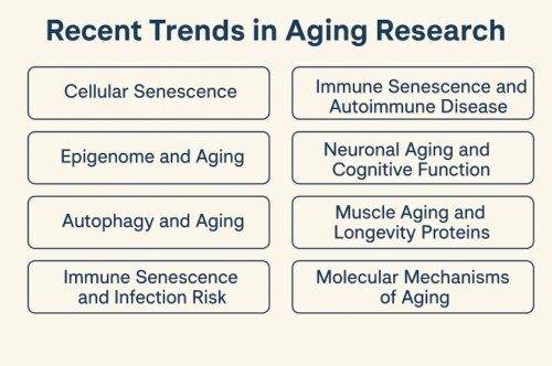老化研究は、分子、細胞、組織、個体といった多層的レベルでのアプローチが進んでおり、以下のテーマが特に注目されています。