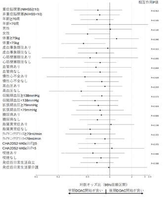 図1.脳梗塞発症30日以内の複合評価に対する脳梗塞重症度や血管危険因子と治療開始時期の相互作用P値