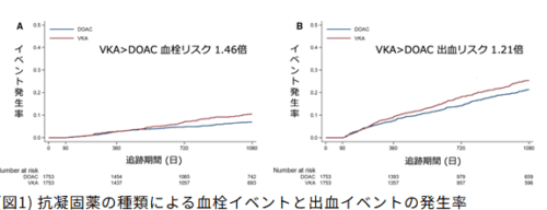 本研究では、2014–2021年に日本でTAVRを受け、心房細動を合併する10,041人の高齢患者を対象に、術後抗凝固薬としてDOACとVKAの臨床効果と安全性を全国レセプト・特定健診データベース(RWD)を用いて比較しました。傾向スコアマッチング解析の結果、3年間の追跡で、VKA群はDOAC群に比べ、血栓イベントリスクが1.46倍(DOAC:2.2 vs VKA:3.6/100人年)、出血イベントリスクが1.21倍(DOAC:7.1 vs VKA:10.0/100人年)と有意な悪化が見られました。人口ベースの大規模データと長期追跡により、DOACがTAVR後の心房細動合併患者における抗凝固療法として、VKAに比べ有効かつ安全な選択肢となる可能性が示されました。これらの知見は、高齢心血管患者における術後管理や薬剤選択に役立つ臨床指針情報となります。