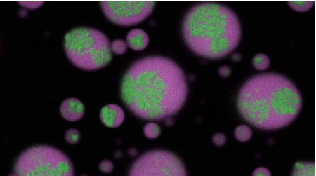RNA clusters (green colored) gradually disassemble within biomolecular condensates (magenta colored), returning the RNA to a soluble state. This occured after an antisense oligonucleotide engineered by the team of Priya Banerjee was introduced to the condensate.