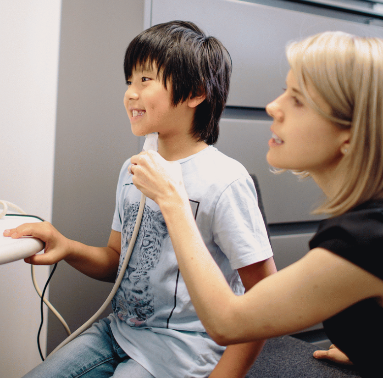 Tara McAllister (right) holds an ultrasound probe under a child’s chin