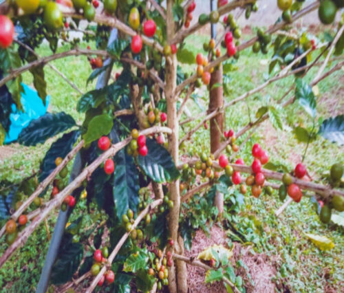 写真のように、一株ごとの間隔を確保した植栽は、直射日光と森の木陰が程よく調和する環境で順調に育っています。葉は厚みを増し、照り返す緑が力強さを物語っています。木々の枝には小さなコーヒーの実が確実に膨らみ始めています。まだ各枝に数粒ずつの実が点々とついている段階ですが、この光景は「いよいよ実りのサイクルが始まった」という確かな証です。