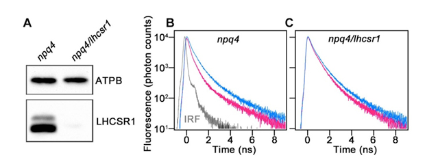 A.LHCSR1の免疫検出。B.ピコ秒蛍光寿命解析(赤:pH5.5, 強光条件相当、青:pH7.5, 弱光条件相当)