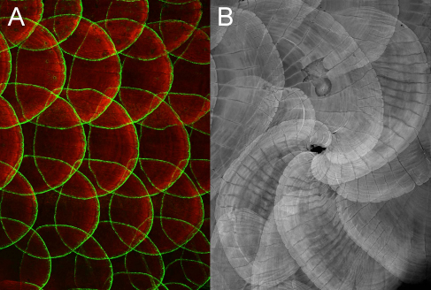 図:(図A)鱗に蛍光タンパク質(GFP、緑)を発現するエンハンサートラップ系統(hspGFFDMC13F;UAS:GFP)の成魚を、カルシウム染色(赤)したもの。鱗の縁(成長端)の骨芽細胞のみがGFPを発現する。(図B)表皮細胞においてWnt/PCPシグナル遺伝子を阻害した魚を、カルシウム染色したもの。鱗のパターンが乱れ「渦」を巻く。